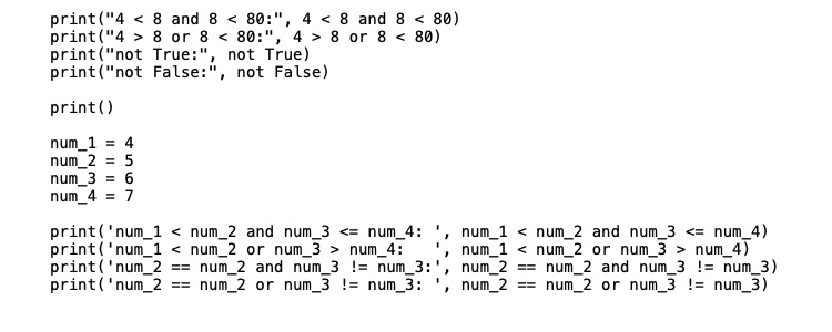 4 < 8 and 8 < 80: True 4 > 8 or 8 < 80: True not True: False not False: True num_1 < num_2 and num_3 <= num_4: True num_1 < num_2 or num_3 > num_4: True num_2 == num_2 and num_3 != num_3: False num_2 == num_2 or num_3 != num_3: True