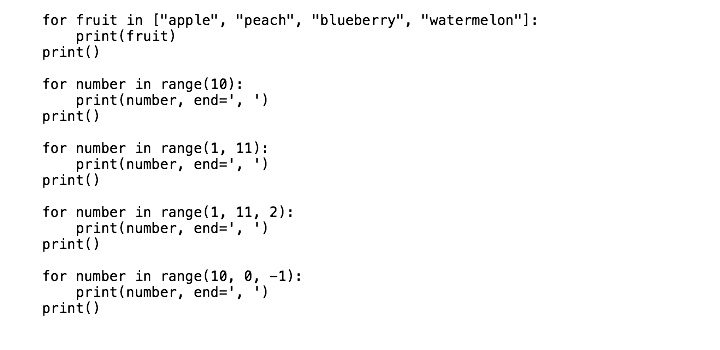 for fruit in ["apple", "peach", "blueberry", "watermelon"]: